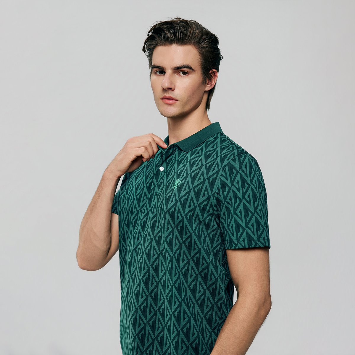 - قميص بولو أنيق وعصري يتميز بنمط هندسي مميز يغطي كامل القميص لإطلالة جريئة.